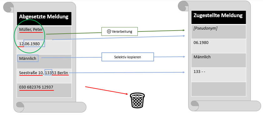 Im DEMIS-Backend gehen die Meldungen zunächst mit vollständigen, namentlichen Personendaten ein (Name, Vorname, vollständiges Geburtsdatum und – sofern angegeben – Geschlecht). Dort wird automatisch eine neue, zunächst leere Meldung erzeugt, in die ausschließlich die für die nichtnamentliche Meldung benötigten Informationen übertragen werden.