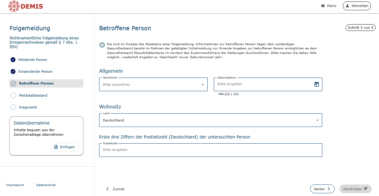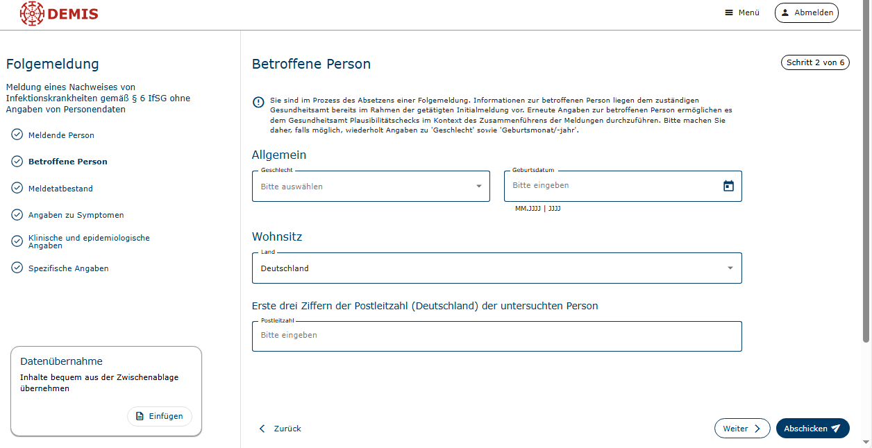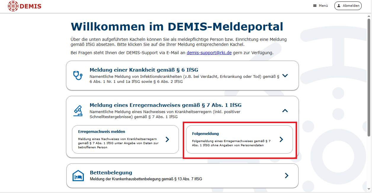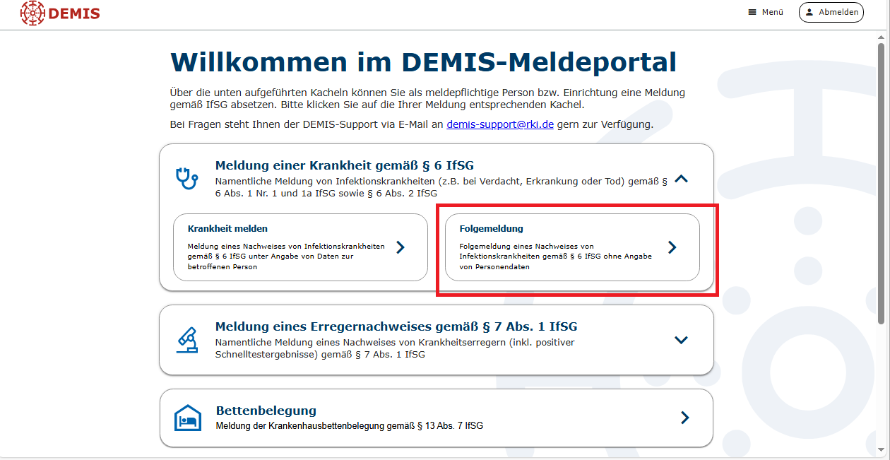 In DEMIS wurde am 19.03.2026 die Funktion der Folgemeldung ohne Angabe von Personendaten für