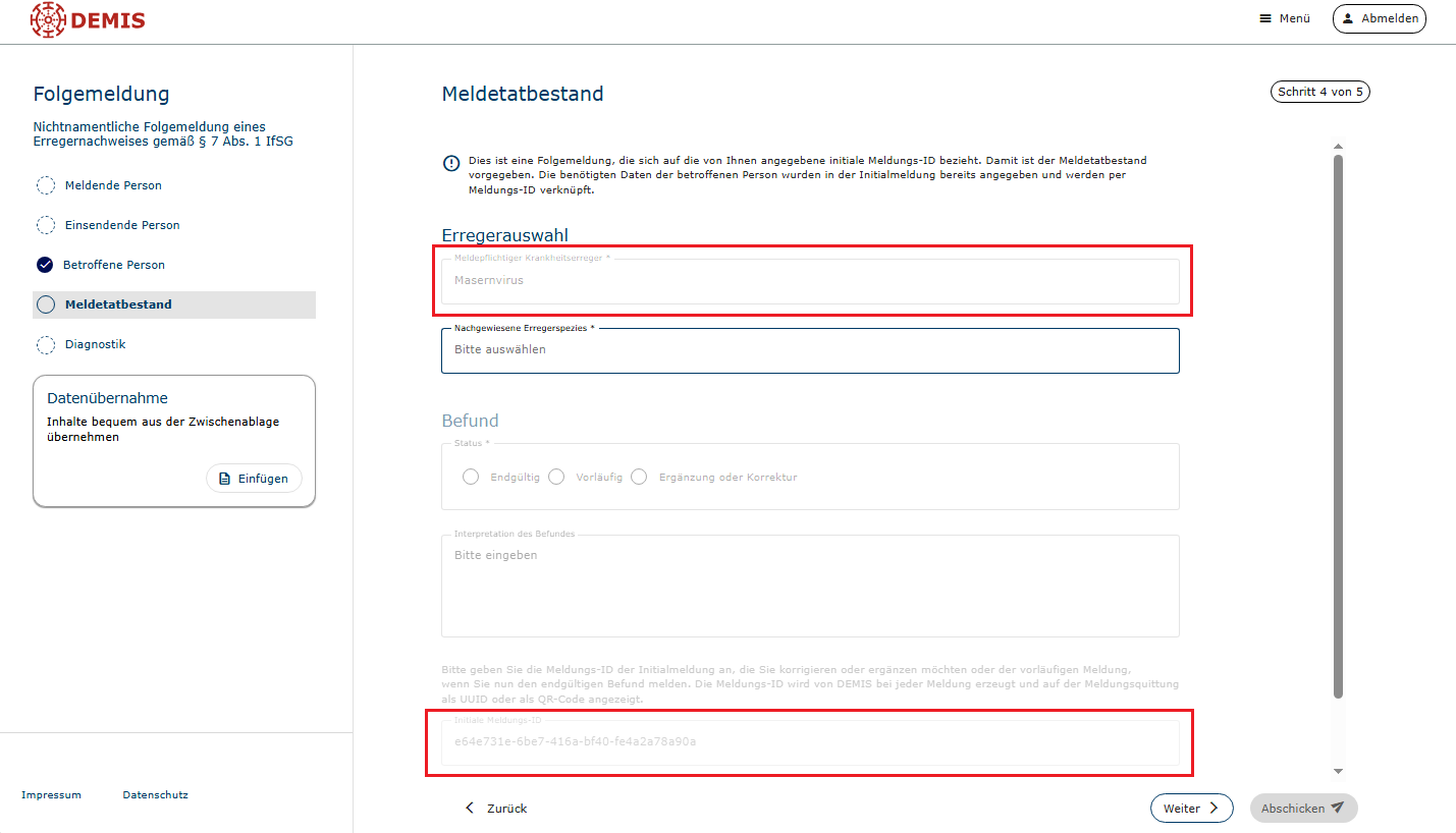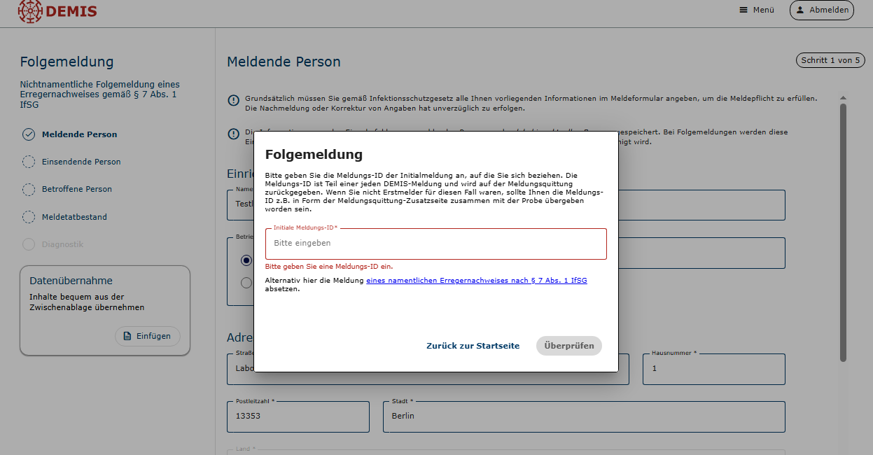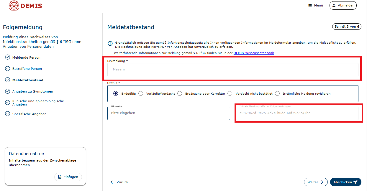 - Die Eingabe der Meldungs-ID der initialen Meldung wurde bisher bereits abgefragt, die Angabe war jedoch nicht verpflichtend. Ohne Angabe der Meldungs-ID war die Zusammenführung im Gesundheitsamt nur schwer möglich und mit hohem Aufwand über den Abgleich der Kontaktdaten der betroffenen Person verbunden.