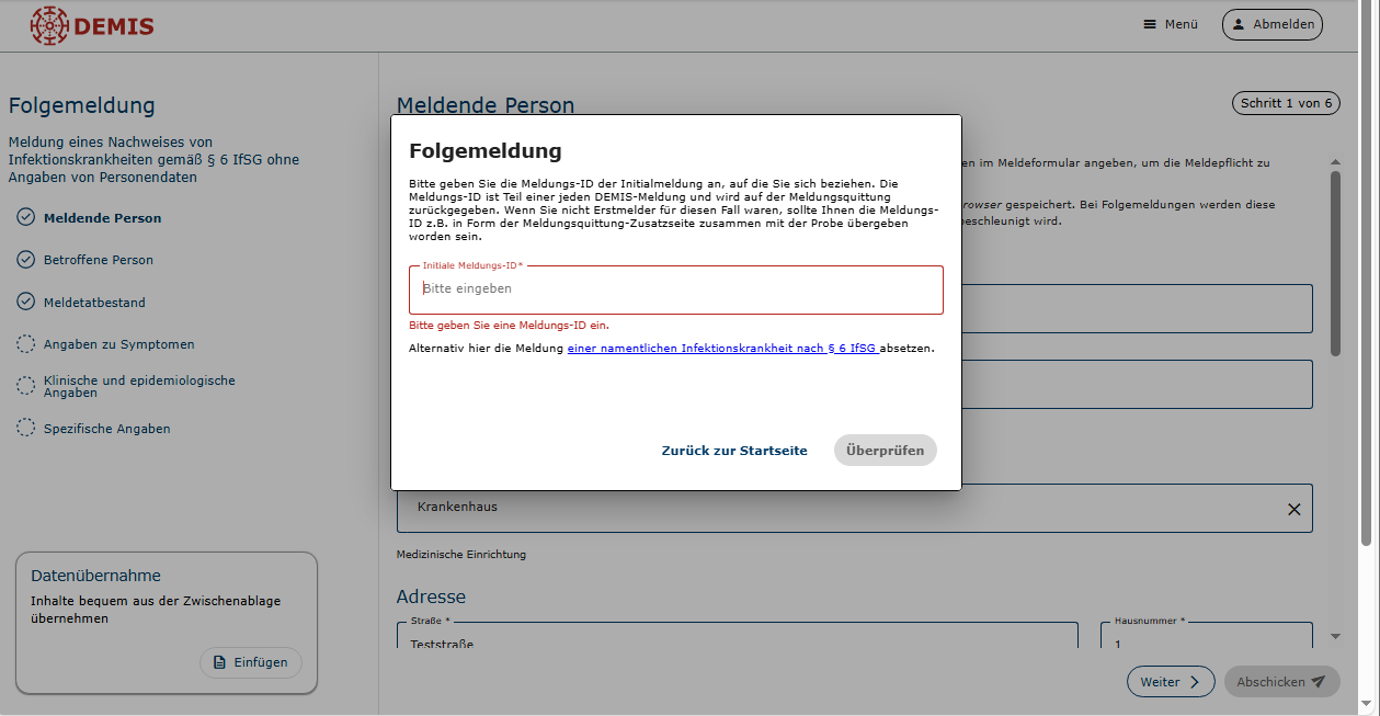 Zum Öffnen der Formularseiten für die Folgemeldung wird in einem Popup die Meldungs-ID der initialen Meldung bzw. einer vorangegangenen Meldung abgefragt, auf die sich die Folgemeldung bezieht (Abb. 3+4).