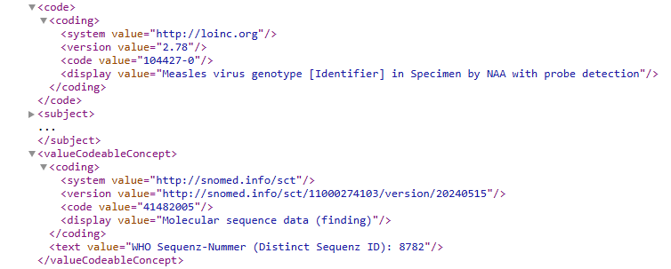 | WHO-Sequenz-Nummer | Wie kann die WHO-Sequenz-Nummer angegeben werden? | Labore haben die Möglichkeit, eine WHO-Sequenz-Nummer z. B. in einer DEMIS-Meldung für Masern anzugeben, welche in der richtigen Kombination auch zu einem Mapping in ein entsprechendes Feld im ÖGD-Softwareprodukt führt. Unter folgenden Bedingungen ist es möglich, die WHO-Sequenz-Nummer in der DEMIS-Meldung anzugeben: Meldetatbestand: MSVP Observation.ValueCodableConcept = 41482005 | Molecular sequence data (finding) Observation.valueCodeableConcept.text = "WHO Sequenz-Nummer (Distinct Sequenz ID): XXXX" → "XXXX" ist hier die spezifische WHO-Sequenz-Nummer. Als Code sieht das dann folgendermaßen aus: Entscheidend sind hier die Angaben des korrekten LOINC (104427-0), des korrekten SNOMED-Codes (41482005) sowie der Angabe von "WHO Sequenz-Nummer (Distinct Sequenz ID): XXXX" im Textfeld. | Labormeldung |