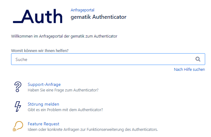 Sofern Sie bereits ein Kundenkonto bei der gematik erhalten haben und für den gematik Authenticator berechtigt wurden, können Sie Ihre Supportanfragen sowie Störungsmeldungen über das Anfrageportal [ Klicke hier ( Anfrageportal des gematik Authenticators ) ] stellen.