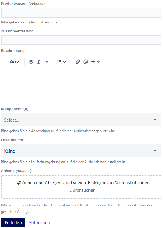 Falls keine hilfreichen Artikel oder Informationen in der Wissensdatenbank gefunden werden konnten, kann über das Anfrageportal des Authenticators durch Ausfüllen diverser Kriterien und Bearbeitungsfelder ein Ticket erstellt werden.