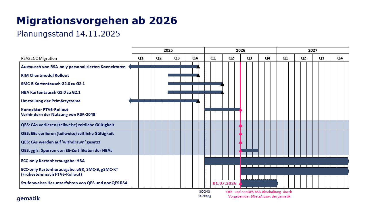 Der Einsatz von RSA (1900–3000 Bit) ist ab 01.07.2026 unzulässig. Die Regelungen gemäß eIDAS und der Bundesnetzagentur lassen keinen Ermessensspielraum zu. Nach Einschätzung von gematik und BSI würde somit die Nutzung von RSA-2048 nach dem Stichtag des SOG-IS-Katalogs als Verletzung der Aufsichtspflichten gewertet. In einem solchen Fall müssten alle betroffenen Zertifikate gesperrt werden.