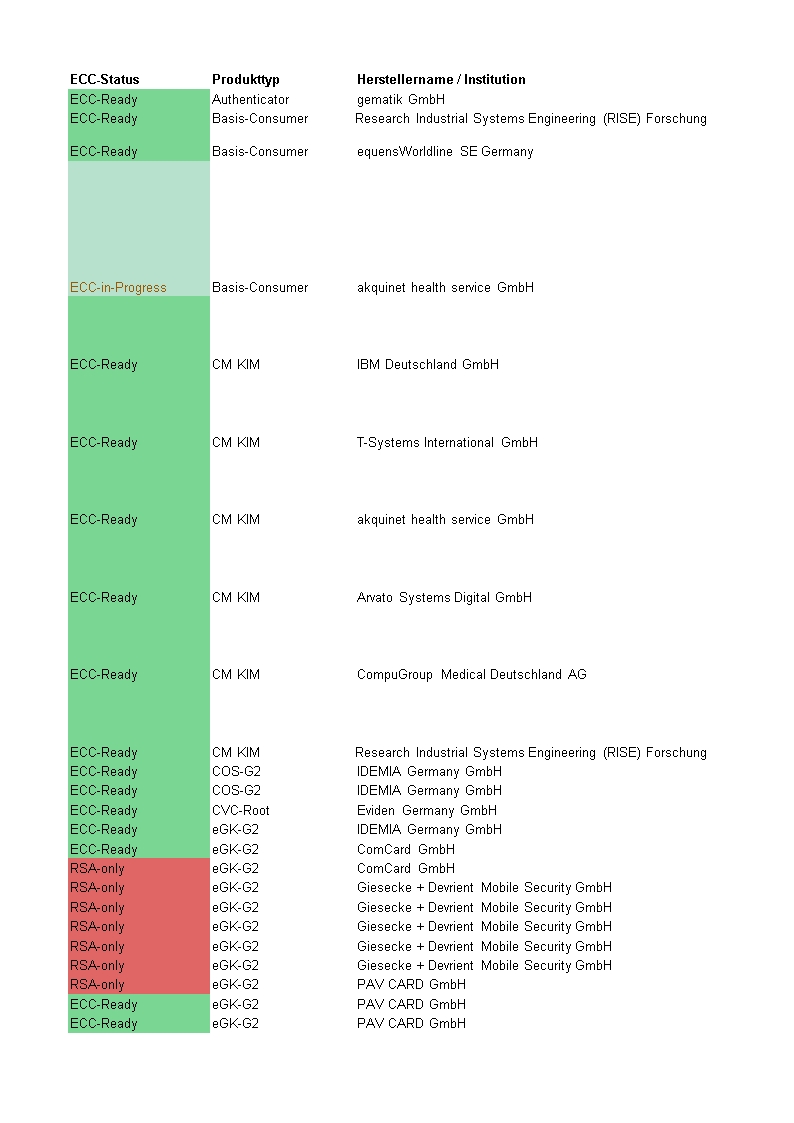 Im Rahmen der Migration wurde der ECC-Status aller zugelassenen und im Betrieb befindlichen Produkte der TI ermittelt. Grundlage hierfür ist die öffentlich zugängliche Tabelle der zugelassenen Produkte im Fachportal der gematik.