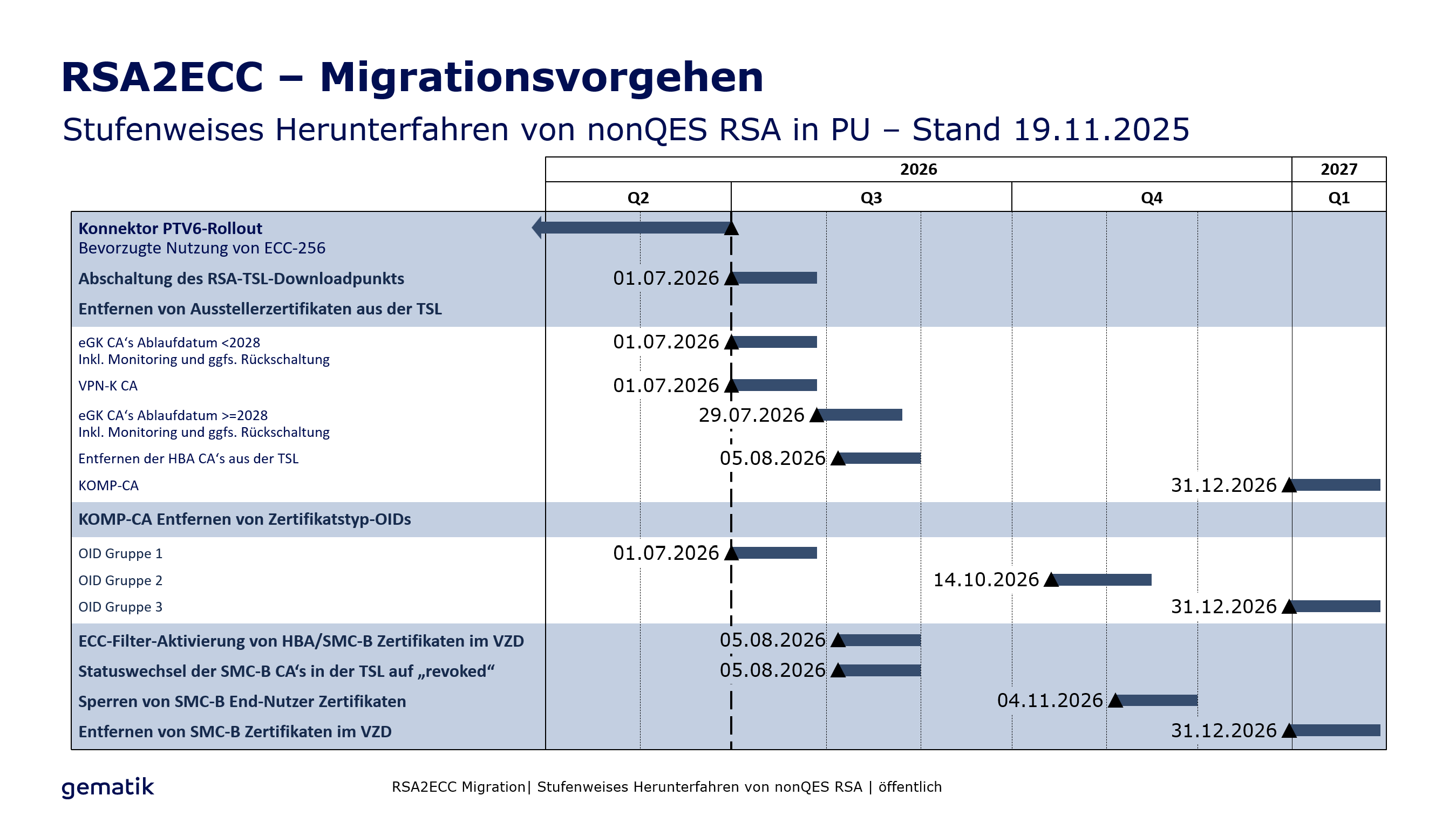 Alle Konnektoren mit RSA-only personalisierten gSMC-K laufen am 31.12.2025 ab und können danach nicht mehr verwendet werden. Solche Konnektoren sind ausschließlich vom Produkttyp EBK und die Ablösung dieser Konnektoren wird von der gematik überwacht. Somit ist ab dem 01.01.2026 die hardwareseitige Voraussetzung für die Ablösung von RSA durch ECC gegeben.