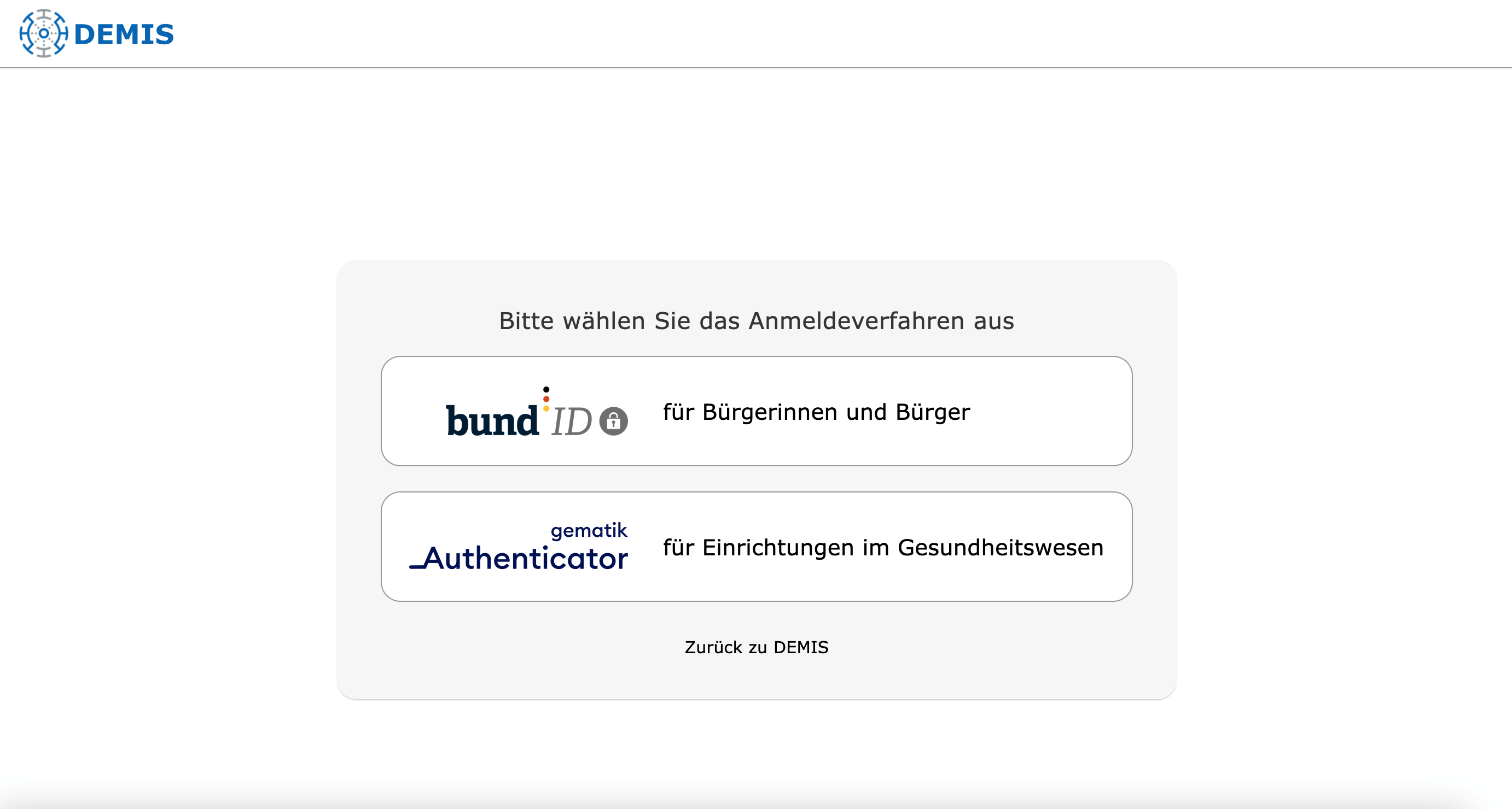 Zur Nutzung des DEMIS-Meldeportals ist eine Anmeldung und Authentisierung notwendig. Zurzeit stehen zwei Authentisierungsmöglichkeiten zur Verfügung: