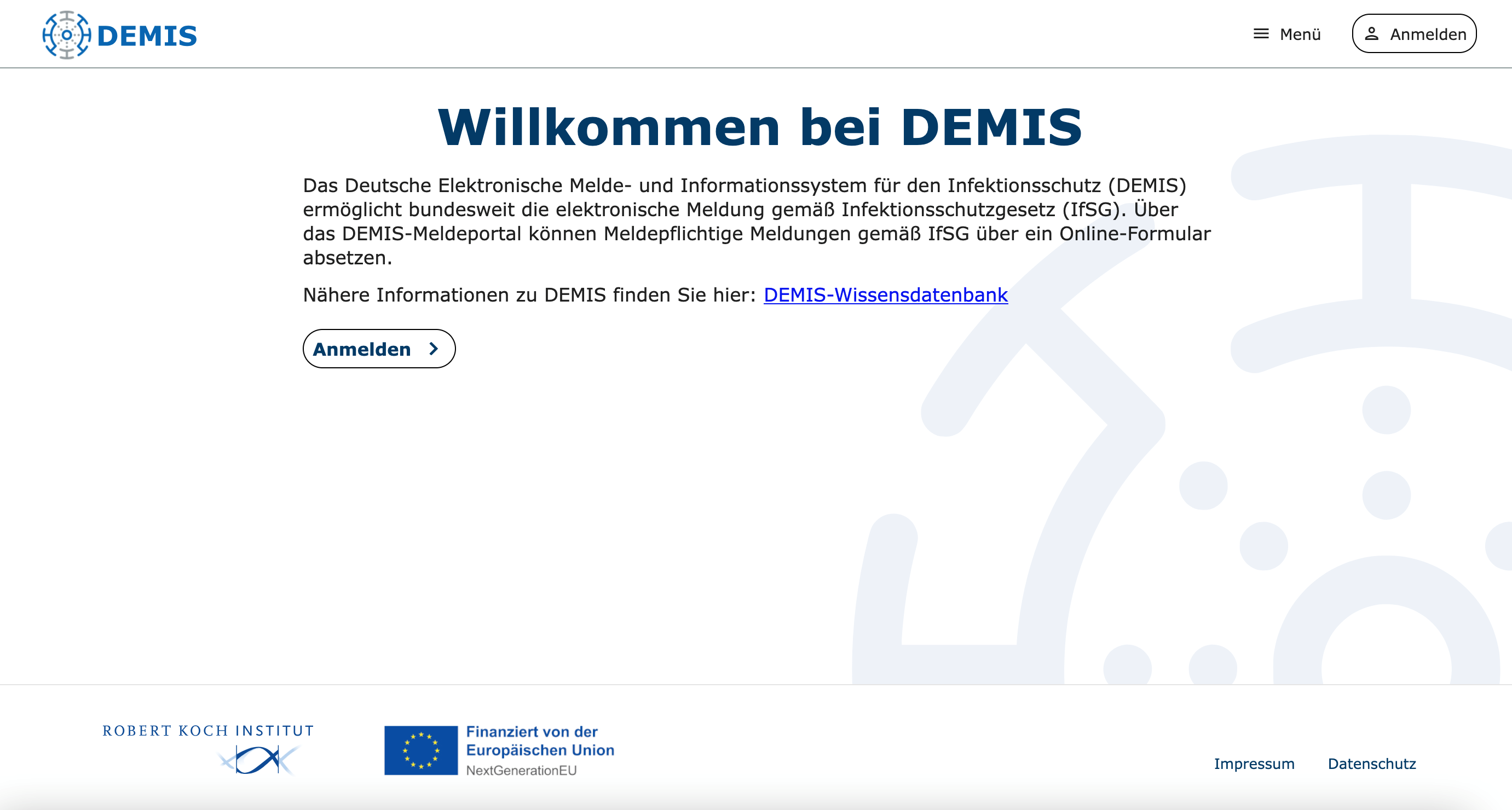 Abbildung 1: Screenshot DEMIS-Meldeportal-Startseite