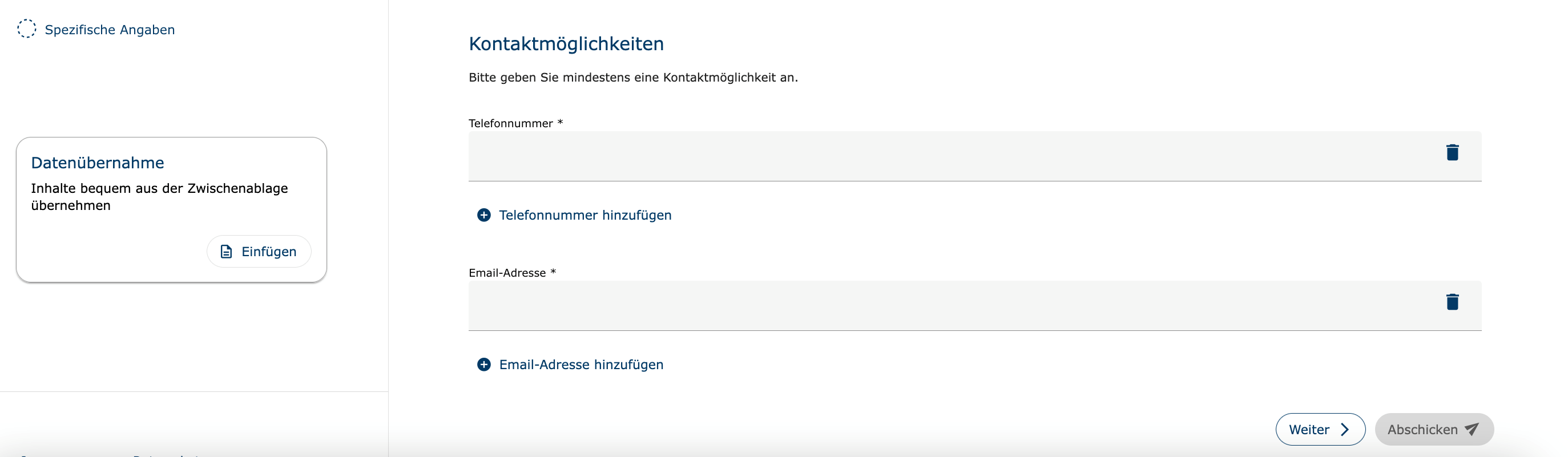 | Kontaktmöglichkeiten: | Es sollte mindestens eine Telefonnummer und/oder E-Mail-Adresse angegeben werden. Telefonnummern müssen zwei Kriterien erfüllen: 1) Beginn mit “0“ oder „+“ und 2) Angabe von mindestens sechs Ziffern. |