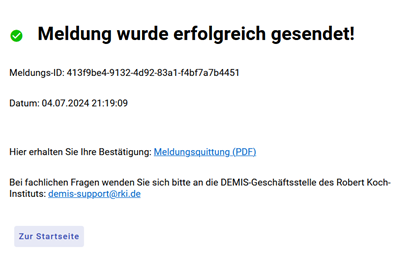 In der Quittung aufgeführt wird ebenfalls eine eineindeutige Meldungs-ID (vgl. farbliche Markierung in Beispielquittung im Anhang). Diese muss bei Rücksprachen mit dem zuständigen Gesundheitsamt oder dem Support angegeben werden.