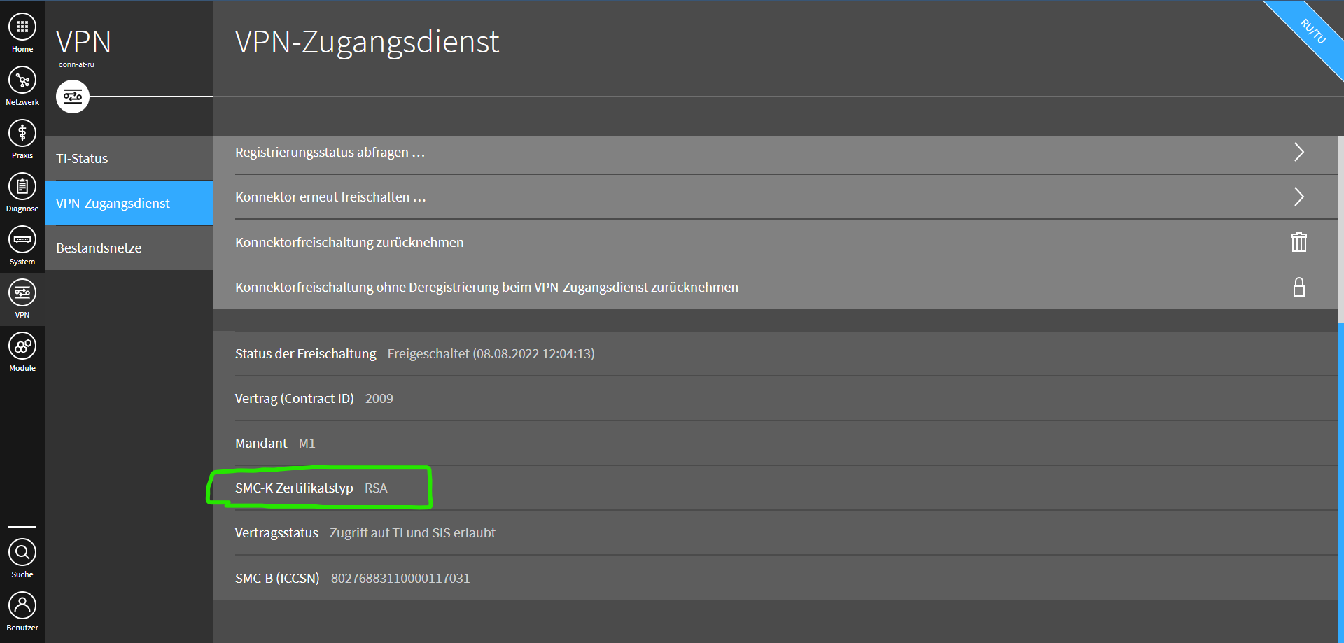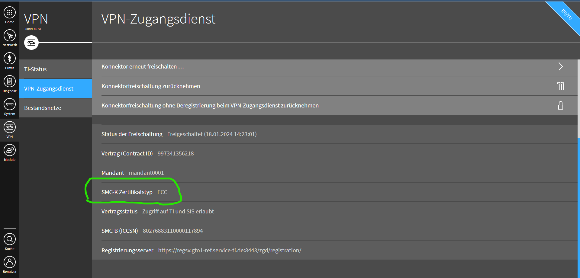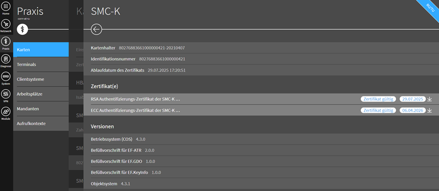 | 2 | Konnektor | Singlepersonalisierte Konnektoren sind nicht nutzbar. | Singlepersonalisierte Konnektoren können nach der RSA-Abschaltung keinen VPN-Tunnel in die TI mehr aufbauen. | Konnektoren mit verbauter G2.0 gSMC-K haben nur RSA Material (kein ECC Material vorhanden). | Keiner verfügbar | Bei Secunet kann in diesem Menü geprüft werden, ob der Konnektor Single- oder Dualpersonalisiert ist (Praxis → Karten): |