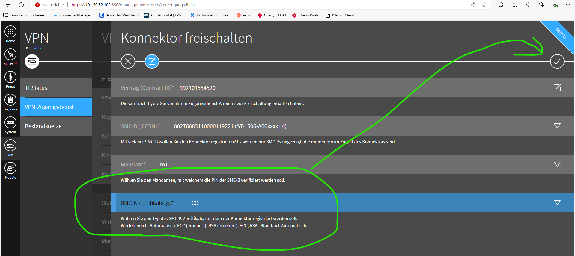 | zu Schritt 1.b (Option 1): Bei Secunet Konnektoren ist die Funktionalität zur automatischen Re-Registrierung mit ECC am VPNZugD defaultmäßig deaktiviert. Diese kann wie folgt aktiviert werden: Konnektor → Netzwerk → VPN → VPN-Zugangsdienst → Erweiterte Einstellungen für die Freischaltung: Das rot Markierte bitte aktivieren zu Schritt 2: |
