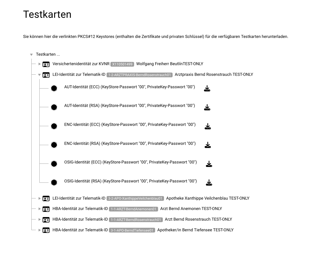 | 28 | Zertifikat | p12-Zertifikatsdateien | Für automatische Tests werden p12-Zertifikatsdateien benötigt | Für Tests ist das manuelle Stecken von Testkarten mitunter sehr aufwändig. Es ist möglich, statt des Steckens einer Karte auch die p12-Datei eines benötigten Zertifikats zu verwenden. | Für einzelne gematik Testkarten können p12-Dateien der enthaltenen Zertifikate aus der ehealthCA exportiert werden. Für entsprechende Aufträge bitte eine entsprechende email an pki@gematik.de schicken.