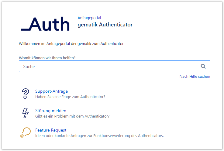 Sofern Sie bereits ein Kundenkonto bei der gematik erhalten haben und für den gematik Authenticator berechtigt wurden, können Sie Ihre Supportanfragen sowie Störungsmeldungen über das Anfrageportal [ Klicke hier ( Anfrageportal des gematik Authenticators ) ] stellen.