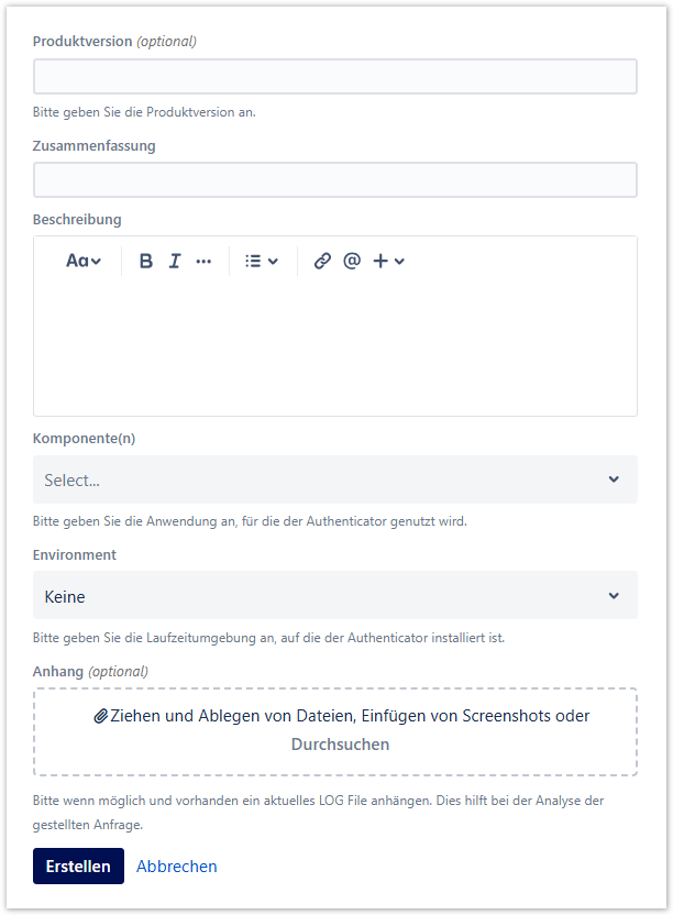 Falls keine hilfreichen Artikel oder Informationen in der Wissensdatenbank gefunden werden konnten, kann über das Anfrageportal des Authenticators durch Ausfüllen diverser Kriterien und Bearbeitungsfelder ein Ticket erstellt werden.